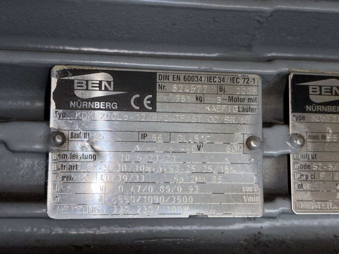 This is a BEN Nürnberg marine electric motor, model KDK200Lb, designed for heavy-duty marine applications. The motor operates at 10.5/21.4 kW, supports 440V at 60Hz, and features an IP56 protection rating, making it ideal for demanding marine environments. It has a 351 kg build and offers a high-performance output with adjustable power modes for various marine operations.