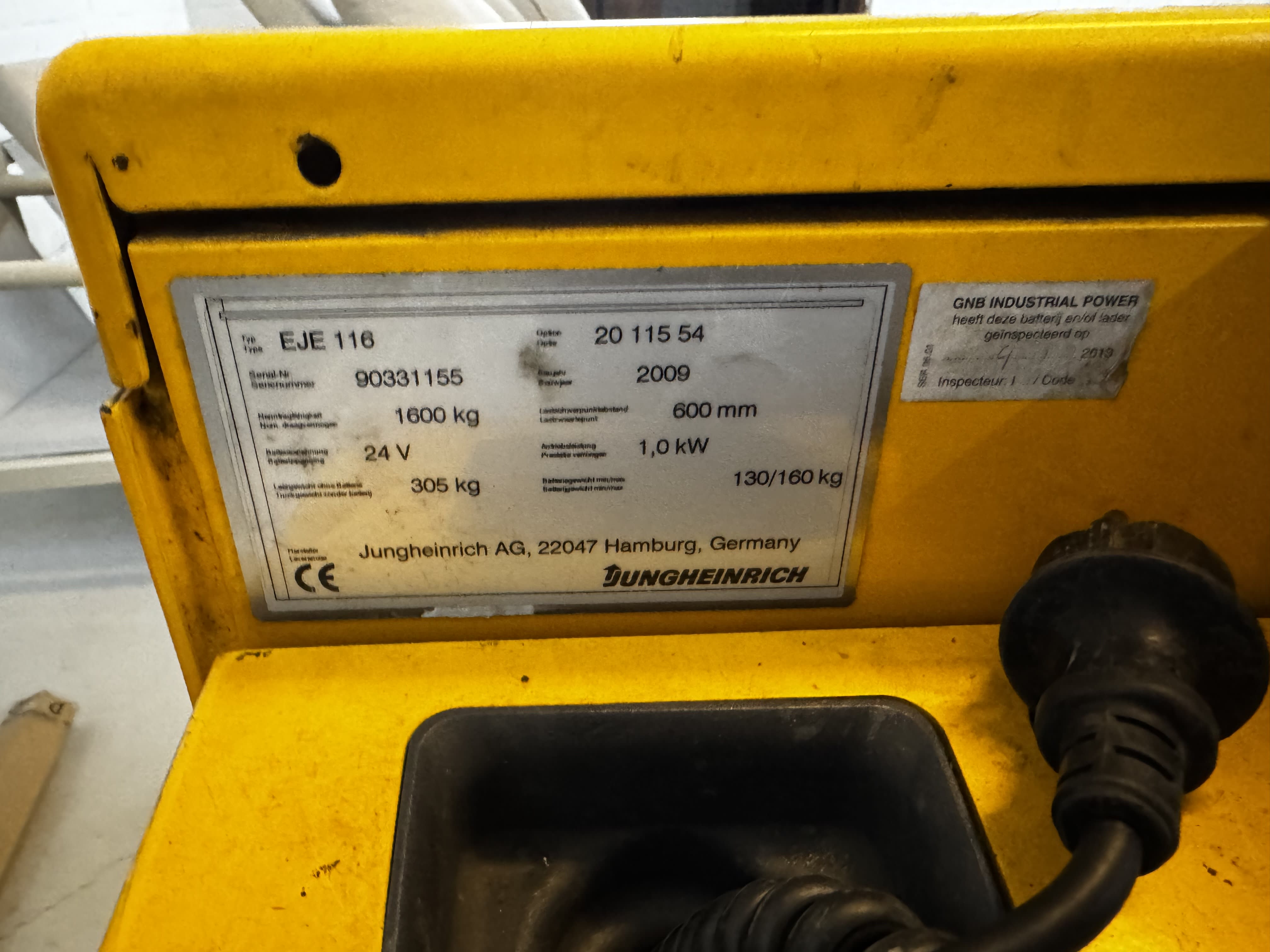 For sale is a Jungheinrich EJE 116 electric pallet truck in solid working condition. Ideal for warehouses, workshops, and industrial facilities. The unit has been well maintained, with all manufacturer specifications visible on the original ID plate.