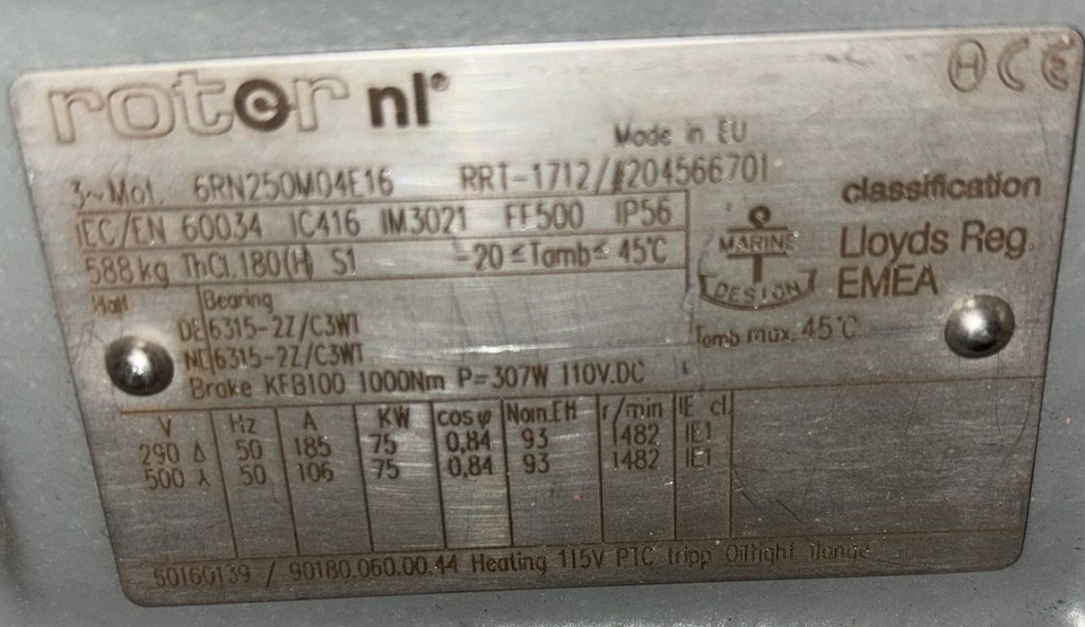 Heavy-duty Rotor NL Marine 3-Phase Electric Motor classified under Lloyd's Register. This motor operates at 75 KW, 1482 RPM, and is designed for marine environments with IP56 protection. Certified for operating under -20°C to 45°C, it features high efficiency with a power factor of 0.84. Suitable for 50Hz applications at 290V/500V. Includes a brake with a capacity of 1000Nm and heating function. Perfect for marine propulsion or auxiliary equipment.