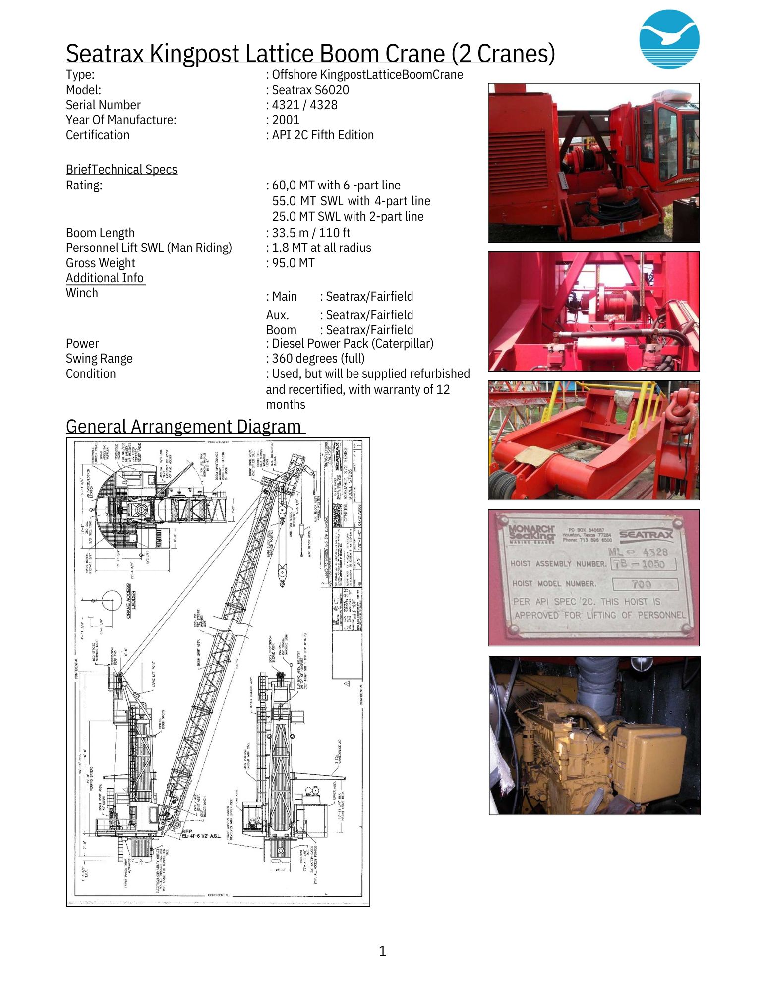 2 units of API 2C , 5th edition Seatrax King Post Cranes with 120 ft boom each. Man riding cranes. Diesel Engine ( Cat Engines) operated Hydraulic power pack. Taken down from a drilling jack up and was stored at a ship yard. Crane purchased as is and is currently being prepared for refurbishment. Crane components dismantled and being inspected prior to refurbishment as per API RP 2D. Crane can be supplied “as-is” or fully refurbished and recertified. New King Post, electrical controls and Hydraulics to be supplied. Engines to be overhauled and dyno tested prior to assembly. Designed for demanding offshore environments. The crane features ergonomically designed, climate-controlled operator cabs with features like large windows, clear controls, and sound isolation for operator comfort and visibility. Seatrax cranes can be easily retrofit and upgraded, including the ability to integrate new design features into older models.